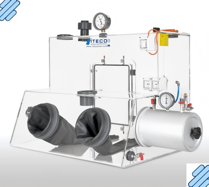 安全玻璃前壁:前壁為安全玻璃,設三個手套口與丁基手套,可上翻開啟,便于設備安裝與維護;